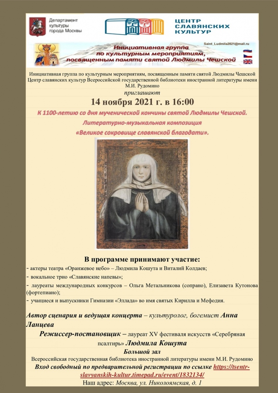 14 ноября в Москве откроют выставку, посвященную первой славянской святой Людмиле Чешской, и покажут литературно-музыкальную композицию «Великое сокровище славянской благодати».