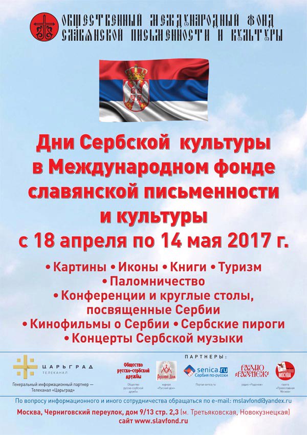 Дни сербской культуры пройдут с 18 апреля по 14 мая 2017 года в Международном фонде славянской письменности и культуры по адресу: г. Москва, Черниговский переулок, д. 9/13, стр. 2, 3 (метро Третьяковская, Новокузнецкая).