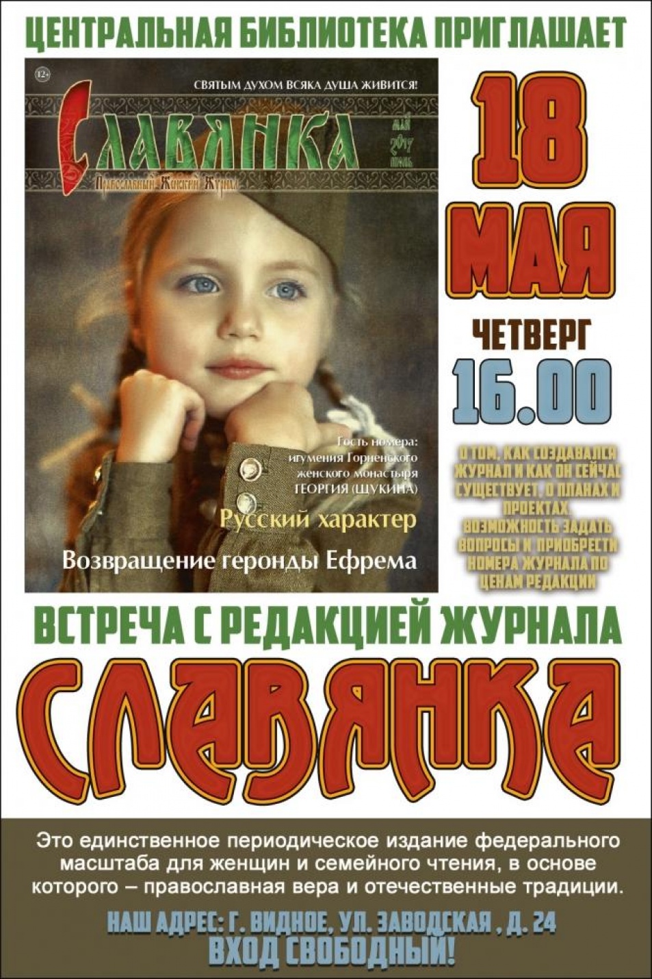 18 мая в 16 ч. состоится встреча редакции Православного женского журнала «СЛАВЯНКА» с читателями в Центральной библиотеке г. Видное. Приходите, будем рады вас видеть и пообщаться!