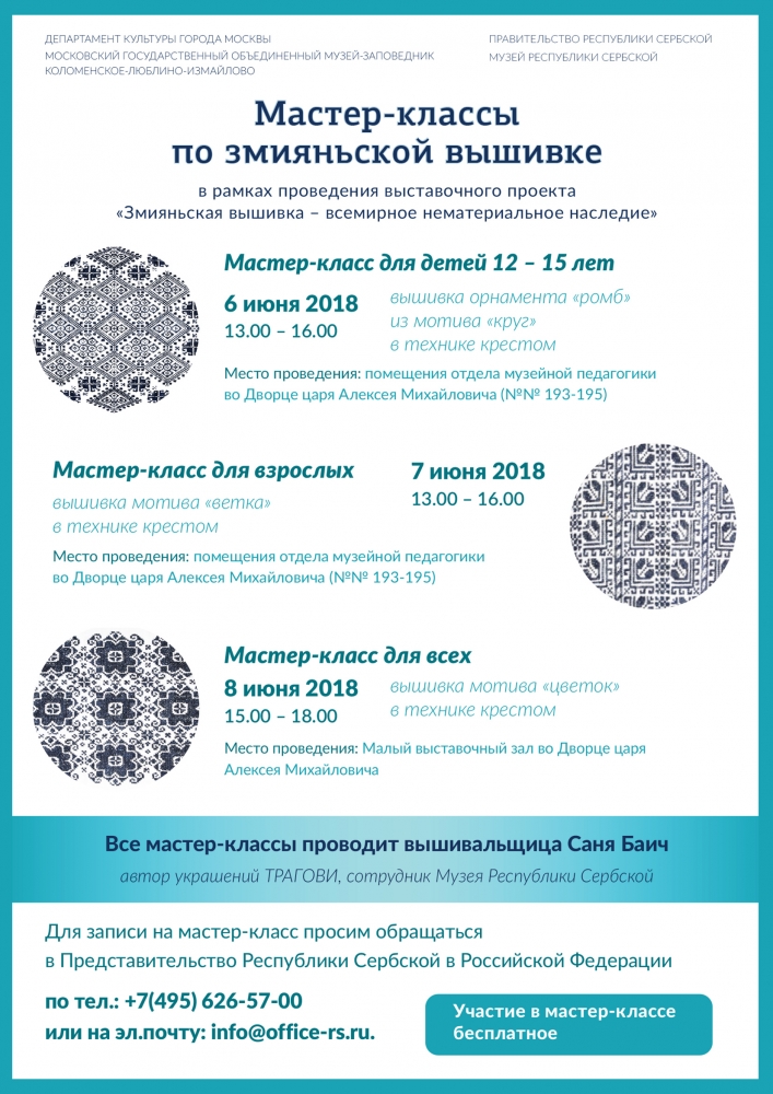 Все мастер-классы проведет вышивальщица Саня Баич, автор украшений «Трагови», сотрудник Музея Республики Сербской. Для записи на мастер-классы обращайтесь в Представительство Республики Сербской в РФ по телефону (495) 626 57 00 или по эл.почте info@office-rs.ru.