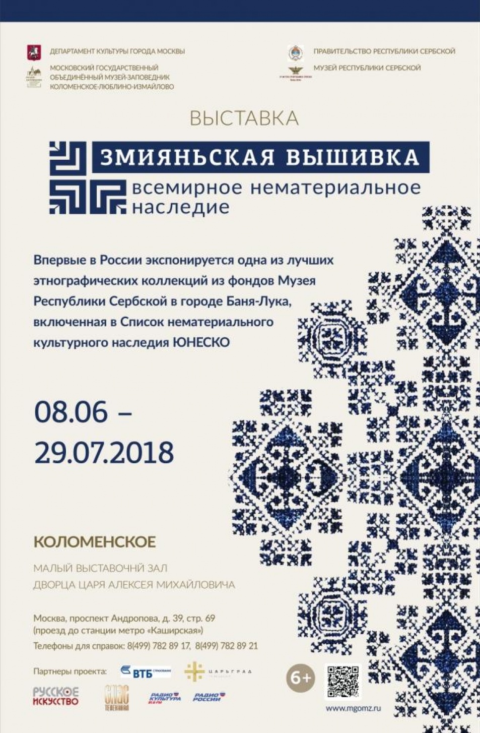 С 9 июня по 29 июля в Малом выставочном зале Дворца царя Алексея Михайловича в Коломенском (г. Москва) будет проходить уникальная выставка «Змияньская вышивка – всемирное нематериальное наследие». В России будет впервые экспонироваться одна из лучших этнографических коллекций из фондов Музея Республики Сербской в г. Баня-Лука, включенная в Список нематериального культурного наследия ЮНЕСКО.