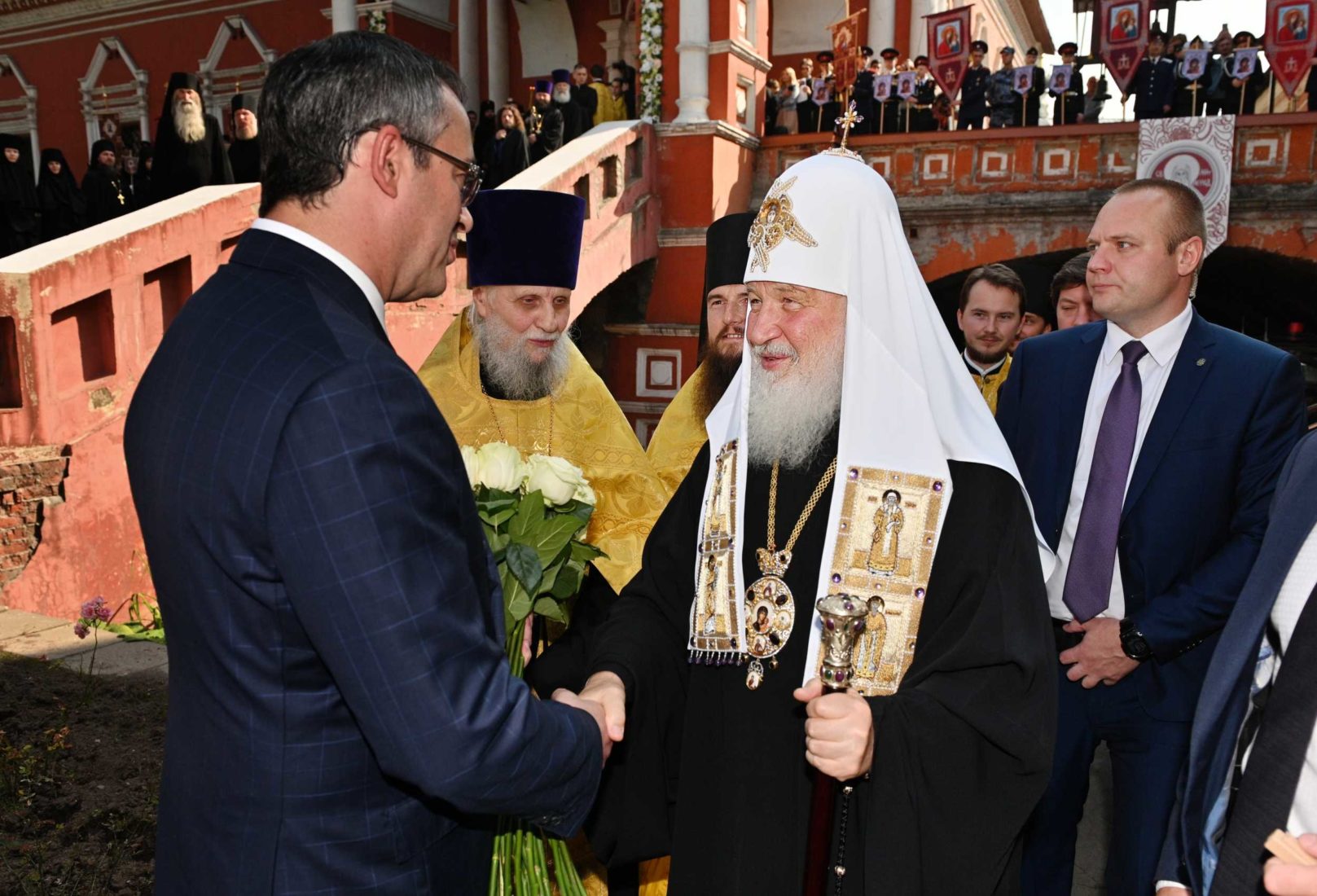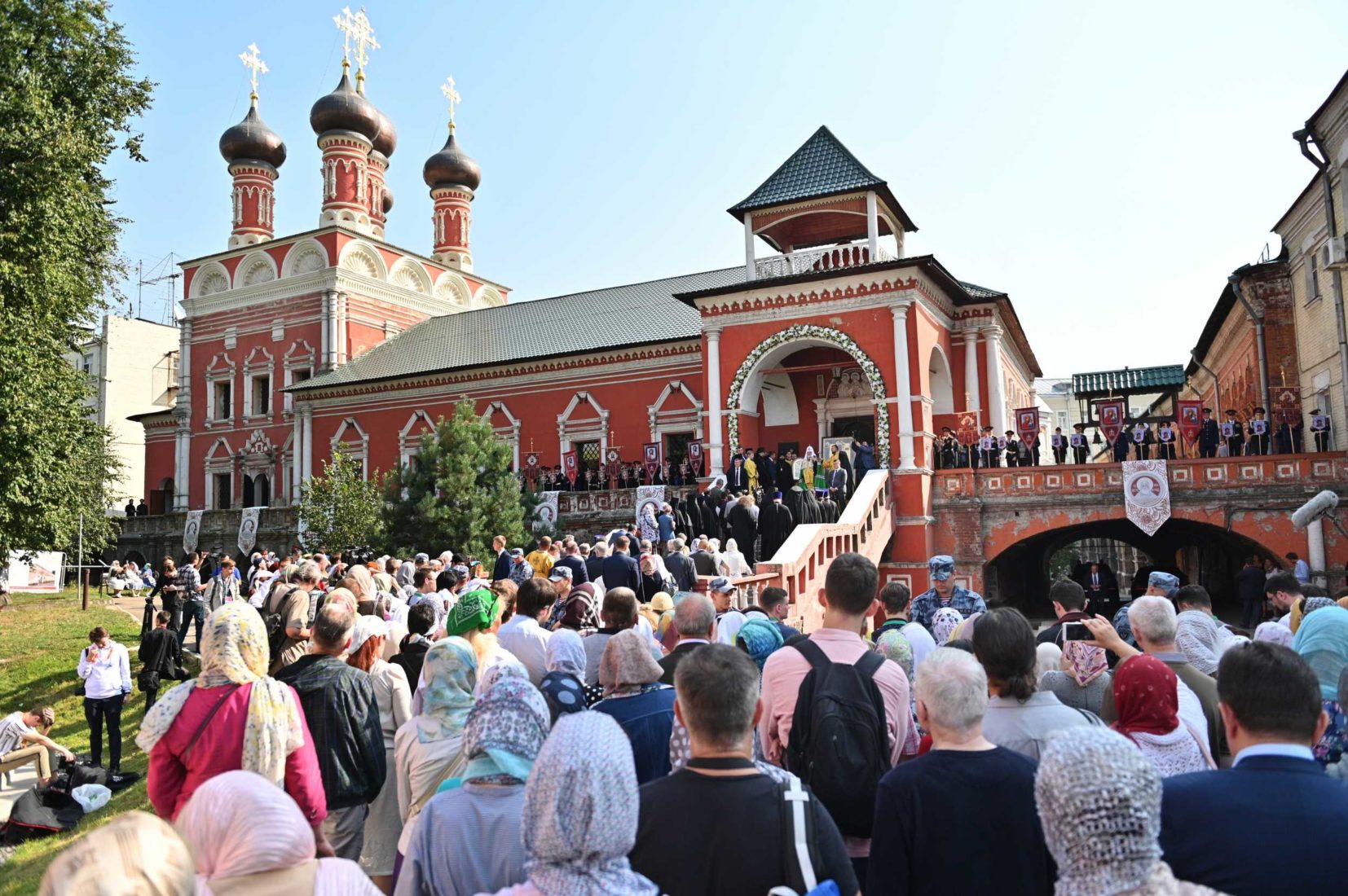 Патриарший молебен в Высоко-Петровской обители предварили Божественная литургия и крестный ход вокруг монастыря, которые возглавил архиепископ Каширский Феогност.