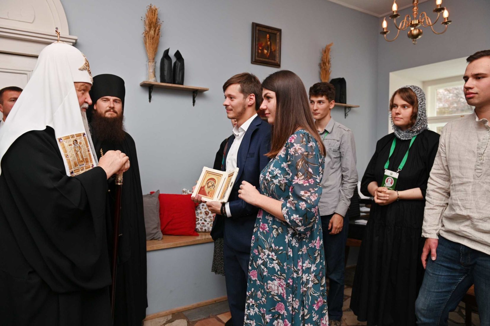 Затем Святейший Патриарх в сопровождении игумена Петра (Еремеева) посетил «Петровскую кофейню» при Петровском культурном центре Высоко-Петровского монастыря, где пообщался со студенческим активом Российского православного университета.