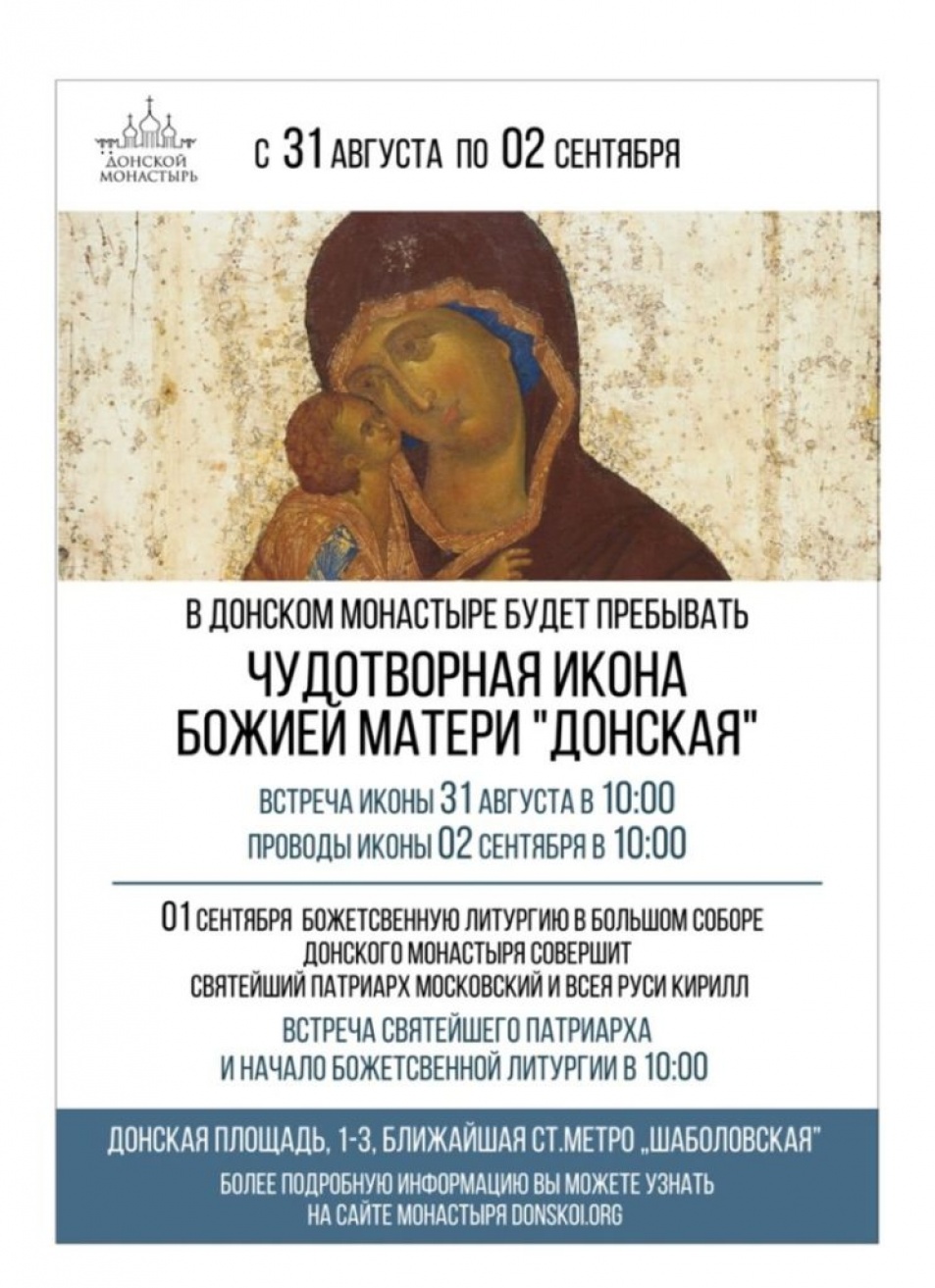 1 сентября 2019 года, в день чествования Донской иконы Божией Матери, в Москве пройдут торжества по случаю престольного праздника Донского ставропигиального мужского монастыря.