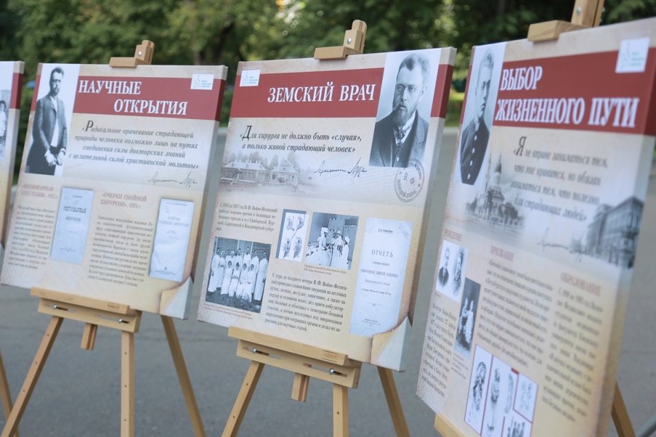 На выставке представлены фотопортреты и рисунки, написанные святителем, и рабочий стол святого с его трудами и копиями личных вещей. В центре экспозиции установлена икона святителя Луки Крымского с частицей мощей святого, подаренная медицинскому учреждению Святейшим Патриархом Московским и всея Руси Кириллом. Посетители выставки могли взять на молитвенную память небольшую копию этого образа.