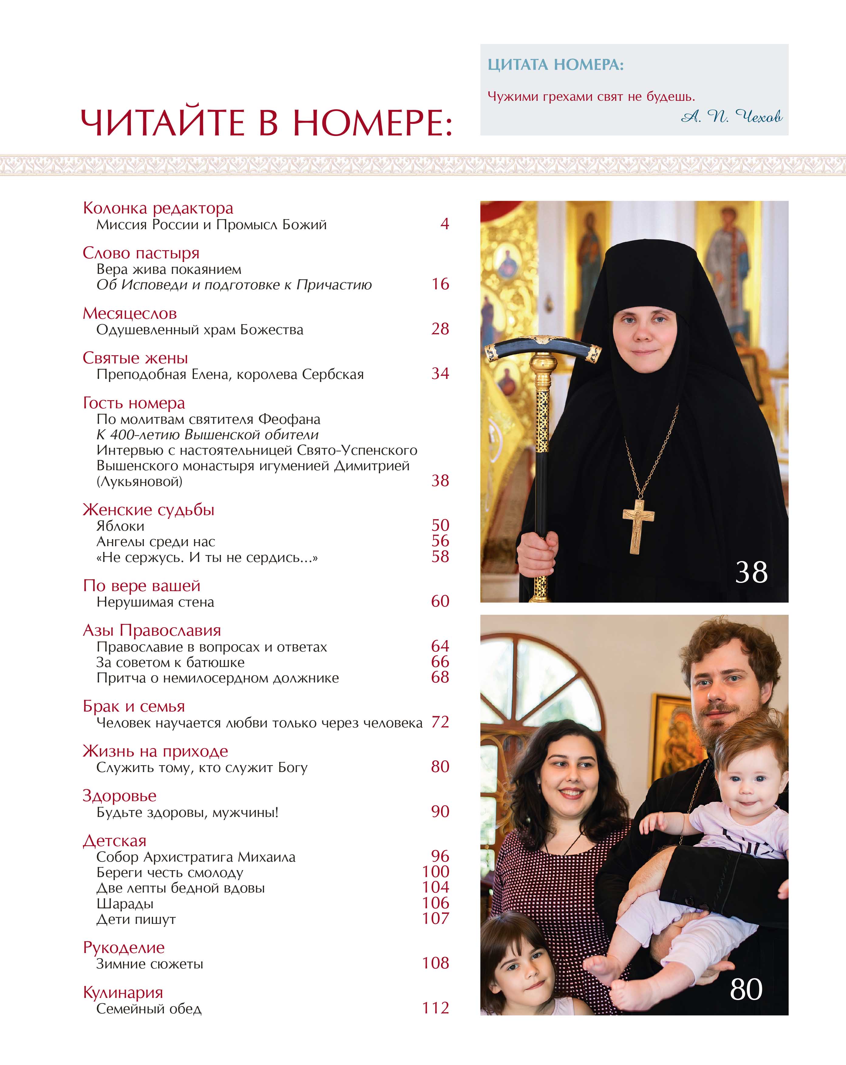 А также читайте в журнале наши традиционные рубрики: «Месяцеслов», «Святые жены», «Женские судьбы», «По вере вашей», «Азы Православия», «Детская», «Рукоделие» и «Кулинария».